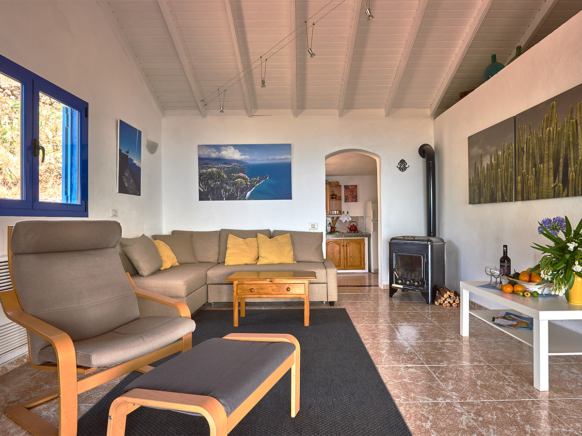 Sitzgarnitur und Schwedenofen. Die Sitzgarnitur kann zu